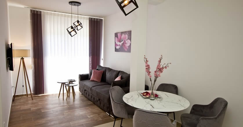 Veći jednosobni apartman sa kupatilom, ukupne površine 34 m2, dekorisan u roze boji sa navedenim pogodnostima.